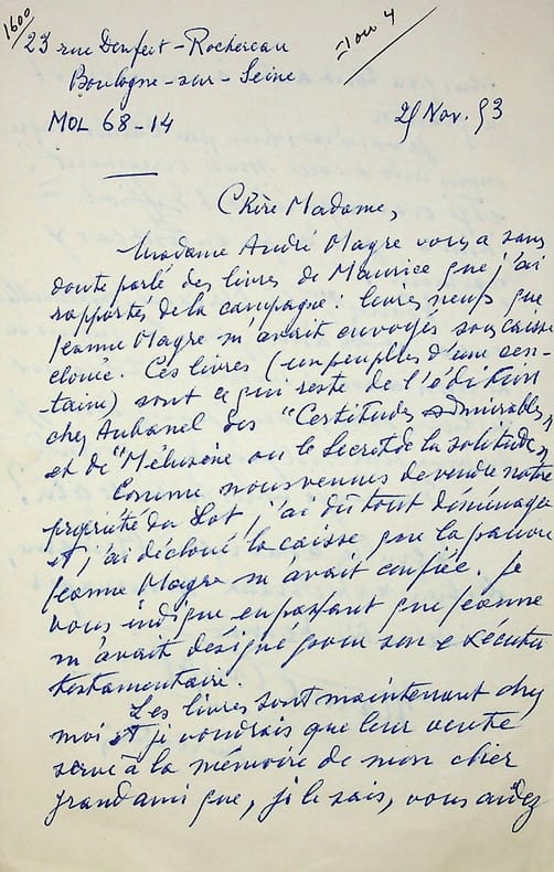 Marcel Cruppi (1883-1958), écrivain, historien, fils du ministre Jean Cruppi. L.A.S., 25 novembre 1953, 2p in-8. Longue lettre à propos des livres de Maurice Magre dont Cruppi a hérité. Il s'agit des restes de l'édition de deux livres publiés chez Aubanel. Il cherche a entrer en contact avec Claude Magre. [407]