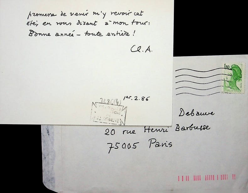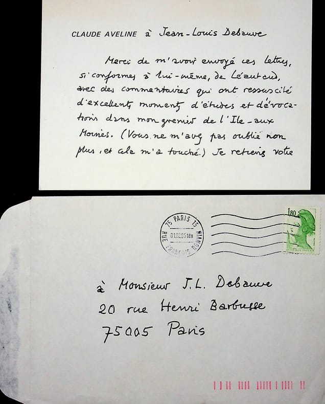 Claude Aveline (1901-1992), poète, écrivain. L.A.S. + enveloppe, 1er février 1986, 1p 1/2 in-8. A Jean-Louis Debauve (1926-2016), magistrat, collectionneur. Remerciements pour l'envoi de son livre de lettres de Léautaud. [407]