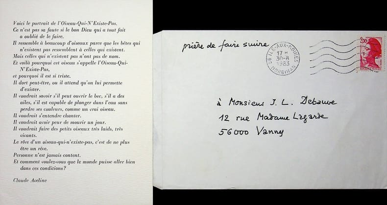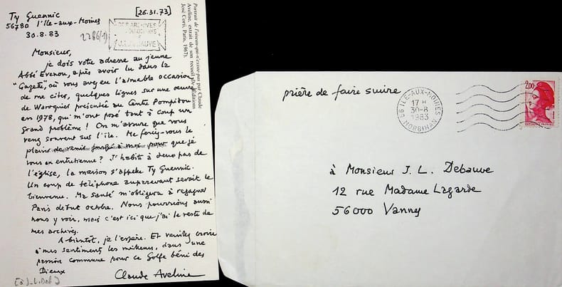 Claude Aveline (1901-1992), poète, écrivain. L.A.S.+enveloppe, 30 août 1983, 1p in-8. A Jean-Louis Debauve (1926-2016), magistrat, collectionneur. Belle lettre l'invitant à venir le rencontrer chez lui, à l'île aux moins. Au dos : poème d'Aveline (imprimé). [407]
