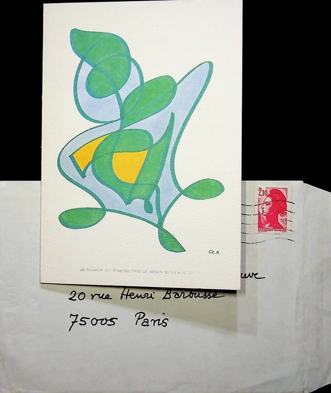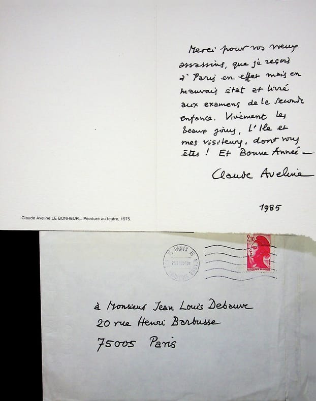 Claude Aveline (1901-1992), poète, écrivain. L.A.S. + enveloppe, 26 janvier 1985, 1p in-8. A Jean-Louis Debauve (1926-2016), magistrat, collectionneur. Sur une carte reproduisant une oeuvre d'Aveline. « Merci pour vos voeux assassins, que je reçois à Paris en effet mais en mauvais état et livré aux examens de la seconde enfance. Vivement les beaux jours, l'île et mes visiteurs dont vous êtes ! Et Bonne Années. Claude Aveline ». [407]