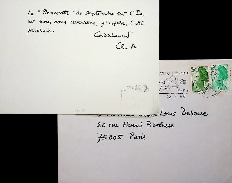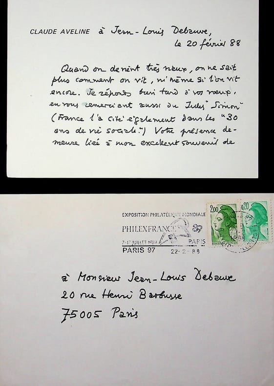 Claude Aveline (1901-1992), poète, écrivain. L.A.S.+ enveloppe, 20 février 1988, 1p 1/2 in-8. A Jean-Louis Debauve (1926-2016), magistrat, collectionneur. Lettre de voeux amicale et tardive, remerciements pour un livre de Debauve. [407]