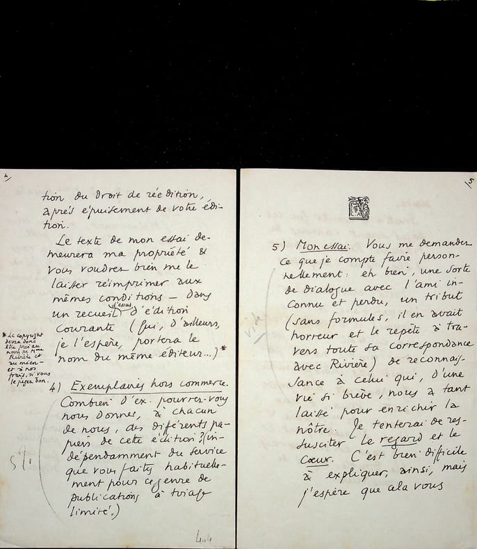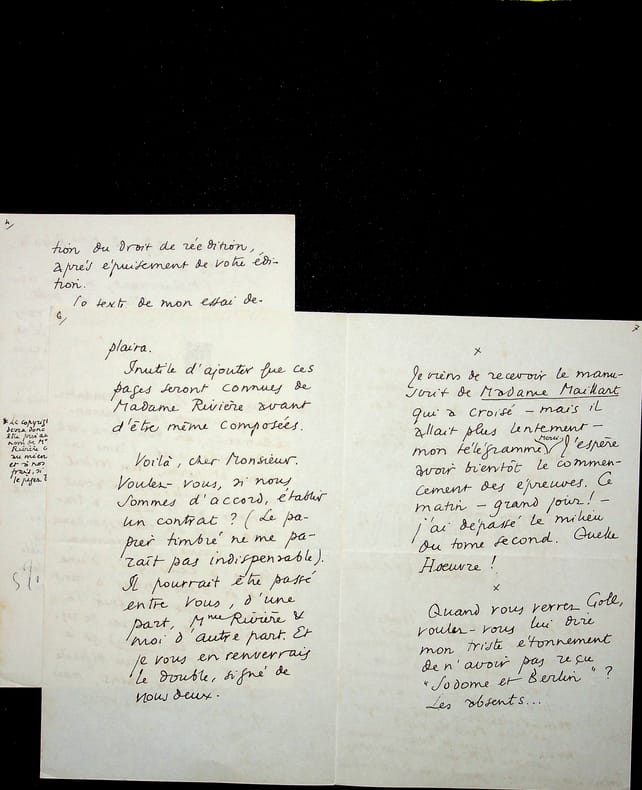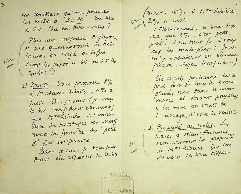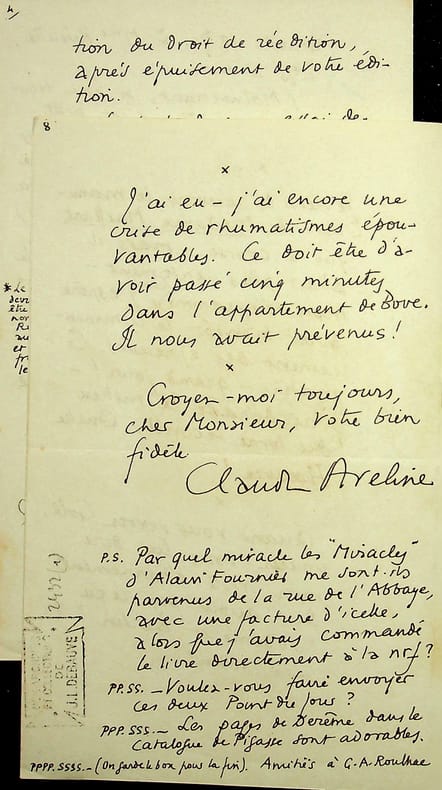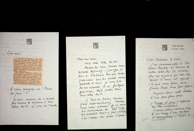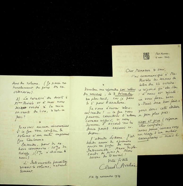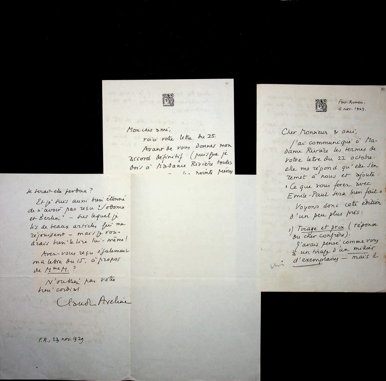 Claude Aveline (1901-1992), poète, écrivain. 3 L.A.S., 6, 23 & 29 novembre 1929, 13p in-8. Important ensemble de trois lettres à l'éditeur Emile-Paul au sujet de la publication des lettres d'Alain-Fournier à René Bichet (1887-1912) (lettres au petit B.). Ces lettres sont alors la propriété d'Isabelle Rivière (1889-1971), veuve de Jacques Rivière (1886-1925) et soeur d'Alain-Fournier (1886-1914). Ces documents sont très intéressants pour l'aspect éditorial de cet ouvrage, publié avec un texte d'Aveline. Aveline était prêt à diminuer au maximum ses droits au profit d'Isabelle Rivière qui désirait donner une partie à la famille de Bichet. Très intéressant ensemble. [407]