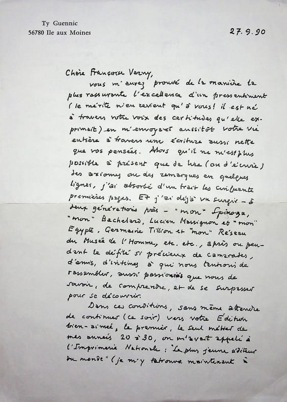 Claude Aveline (1901-1992), poète, écrivain. L.A.S., 27 septembre 1990, 1p 1/2 in-4. A Françoise Verny (1928-2004). Belle lettre sur son livre Le plus beau métier du monde qu'il a commencé à lire et qui concerne les éditeurs. Aveline a été éditeur, « le seul métier de mes années 20 à 30 ». Beau courrier. [407]