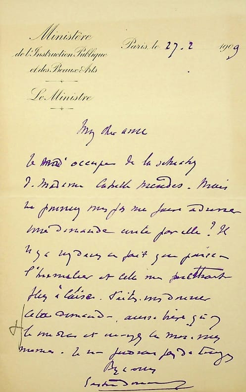 Gaston Doumergue (1863-1937), homme politique, président de la république. L.A.S., Paris, 27 février 1909, 1p in-8. « Mon cher ami, Je m'occupe de la recherche de madame Catulle Mendès. Mais ne pouvez-vous pas me faire adresser une demande écrite par elle ? Il n'y a rien dans ce fait qui puisse l'humilier et cela me mettrait plus à l'aise. Faites-vous donner cette demande. [mots illisibles] et envoyez la moi vous-même. Je ne [mot illisible] pas de [mot illisible]. Bien à vous. Gaston Doumergue ». [408]