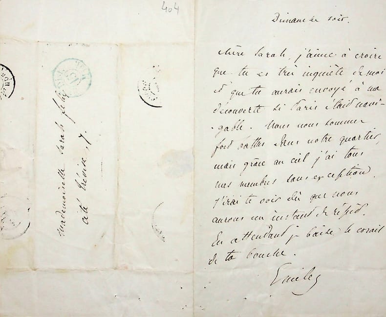 Emile Augier (1820-1889), poète, écrivain. L.A.S., sd [dimanche soir, ca.1870], 1p in-12. A Sophie Félix dite Sarah Félix (1819-1877), soeur de Rachel. « chère Sarah, j'aime à croire que tu es très inquiète de moi et que tu aurais envoyé à ma découverte si Paris était navigable. Nous nous sommes fort battus dans notre quartier mais grâce au ciel j'ai tous mes membres sans exception. J'irai te voir dès que nous aurons un instant de répit. En attendant, je baise le corail de ta bouche. Emile ». Cachet de la collection Jean-Louis Debauve. Belle lettre. [408]