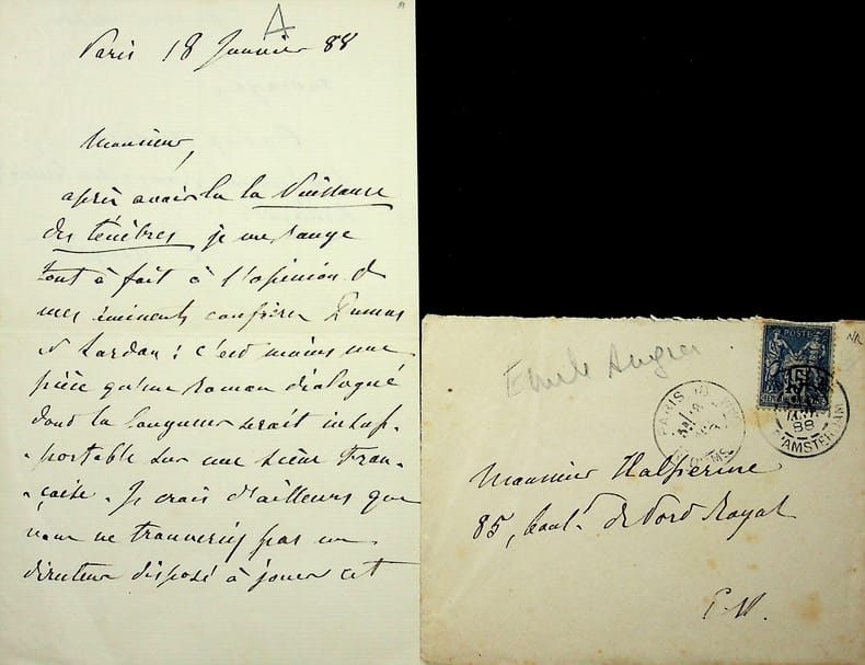 Emile Augier (1820-1889), poète, écrivain. L.A.S.+enveloppe, Paris, 18 janvier 1888, 1p 1/4 in-8. A l'écrivain Ely Halpérine-Kaminsky (1858-1936). « Monsieur, après avoir lu la Naissance des Ténèbres, je me range tout à fait à l'opinion de mes éminents confrères Dumas et Sardou : c'est moins une pièce qu'un roman dialogué dont la longueur serait insupportable sur une scène française. Je crois d'ailleurs que vous ne trouveriez pas un directeur disposé à jouer cet ouvrage. Agréez, Monsieur, l'expression de mes sentiments distingués. E Augier ». Cachet de la collection Jean-Louis Debauve. [408]