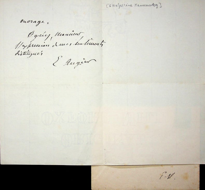Jules Claretie (1840-1913), écrivain, administrateur général de la Comédie-Française. L.A.S., 23 décembre 1896, 1p in-8. A l'écrivain Ely Halpérine-Kaminsky (1858-1936). Il lui transmet une lettre de Tourgueniev concernant le peintre russe Vassili Verechtchaguine. Il précise : « Vereschagin qui signe maintenant Veretschagin) ». Cette lettre a malheureusement disparu. Cachet de la collection Jean-Louis Debauve. [412]