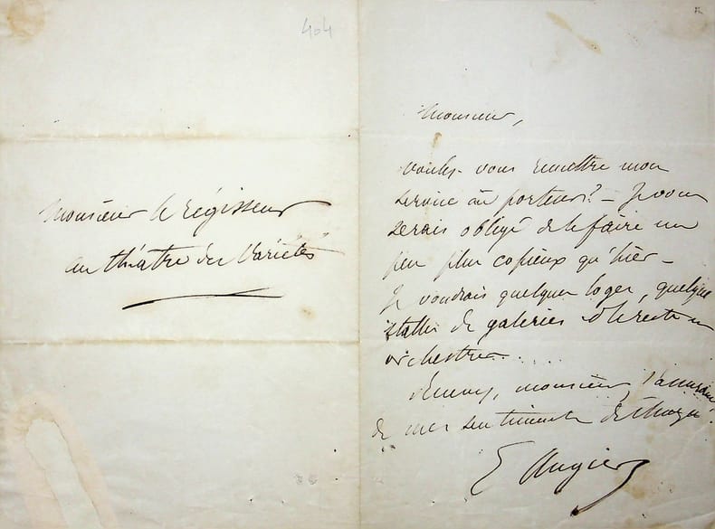 Emile Augier (1820-1889), poète, écrivain. L.A.S., sd, 1p in-8. Au régisseur du théâtre des variétés. « Monsieur, voulez-vous remettre mon service au porteur ? Je vous serais obligé de le faire un peu plus copieux qu'hier. Je voudrais quelques loges, quelques stalles de galerie et le reste en orchestre. Recevez, monsieur, l'assurance des sentiments distingués. E Augier ». Cachet de la collection Jean-Louis Debauve. [408]