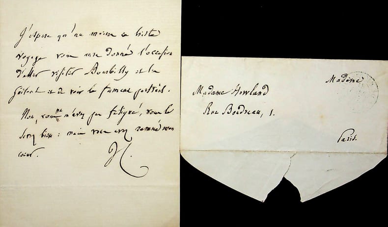 Victor Cousin (1792-1867), philosophe, homme politique, membre de l'Académie française. L.A.S.+enveloppe, 15 octobre 1864, 3p in-12. A Hortense Howland (1835-1920), né Louise-Marie Delaroche-Laperrière. « Ma chère madame Howland, vous n'avez pas affaire à un ingrat. Vous savez qu'à mon retour vous avez eu ma première visite. À la nouvelle de la mort de votre frère, je me suis empressé de vous écrire. Votre silence et la crainte de vous importuner m'ont seuls empêché de vous aller voir. J'apprends avec douleur que vous partez pour l'Amérique. Je en connais malheureusement personne à New-Yorck [sic]; mon seul correspondant était le Dr Henry, professeur de philosophie à l'Université de cette ville, qui l'a quittée il y a quelques années. Puissiez-vous venir à bout de la mauvaise volonté de Mr Howland, et puissiez-vous revenir bien vite et plus heureuse ! Mon voeu est aussi sincère, aussi profond que désintéressé. Je donnerais beaucoup pour pouvoir vous être utile et vous prouver que mon coeur n'est point changé. Vous savez ce qui m'a forcé de ne plus aller chez vous, mais il n'est pas en votre pouvoir de me faire oublier à quel point vous m'avez été chère, quel noble [mot illisible] j'avais tiré pour vous, et quel chagrin j'ai ressenti en voyant mon rêve s'évanouir. Vous le voyez : au moment de vous perdre, la main me tremble d'écrire ce nom fatal d'adieu et je vous quitte le coeur troublé. Je n'ose vous dire les voeux que je forme pour vous, et je me borne à vous assurer que jamais vous ne ferez appel en vain à mes inviolables sentiments. Bien à vous du fond du coeur. Victor C ». Cachet de la collection Jean-Louis Debauve. [408]