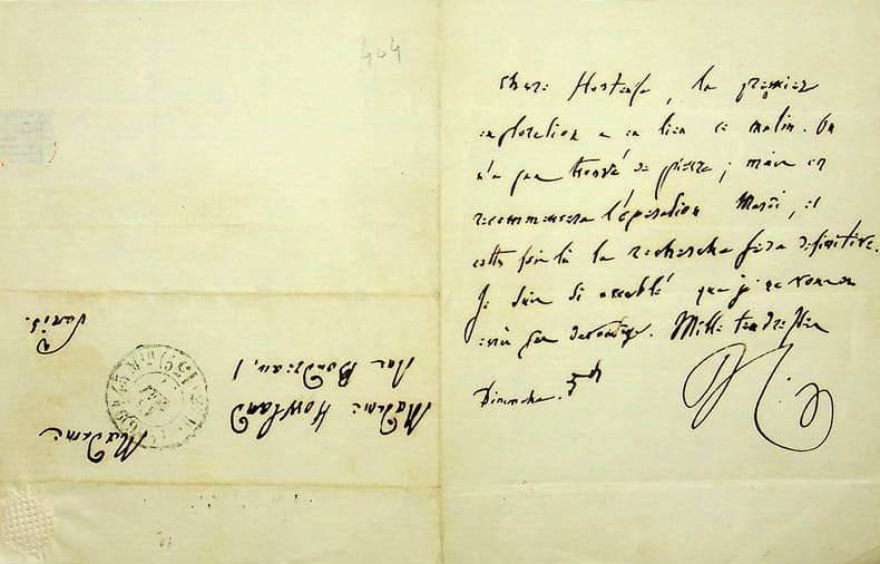 Victor Cousin (1792-1867), philosophe, homme politique, membre de l'Académie française. L.A.S.+enveloppe, 9 avril 1857, 2p in-12. A Hortense Howland (1835-1920), né Louise-Marie Delaroche-Laperrière. « quand votre billet m'est arrivé, j'étais aux mains du chirurgien : l'essai a manqué de [mot illisible], et j'ai devant moi une [mot illisible] de longue souffrance. Puissè-je bien la supporter ! L'homme que j'ai tant recommandé à votre ami de la presse s'appelle Morin. Il est maréchal du logis dans la gendarmerie de la garde impériale ; il a fait la campagne de Crimée, et il était à l'assaut de Malakoff. Son seul tort est de n'y avoir pas été blessé. Mais il a rapporté à [mot illisible] le germe d'une ophtalmie [mot illisible] il est maintenant à l'hôpital. Je crois bien que la bonne Louise de la Miséricorde vous plait plus que M. Co. Quand vous voudrez d'autres livres, je suis à vos [mot illisible]. Vous ne me dites rien de vous. V.C. ». Louis de la Miséricorde est le nom de religieuse choisi par Louise de La Vallière quand elle rentre dans les ordres. Cachet de la collection Jean-Louis Debauve. [408]