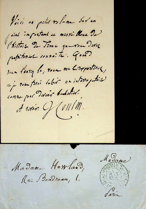 Victor Cousin (1792-1867), philosophe, homme politique, membre de l'Académie française. L.A.S.+ enveloppe, 31 janvier 1857, 1p in-12. A Hortense Howland (1835-1920), né Louise-Marie Delaroche-Laperrière. « voila un petit volume sur un point important et merveilleux de l'histoire de France que vous devez parfaitement connaître. Quand vous l'aurez lu, vous me le rapporterez, et je fous ferai subir un interrogatoire comme pour devenir bachelier. A revoir. VCousin ». Cachet de la collection Jean-Louis Debauve. [408]