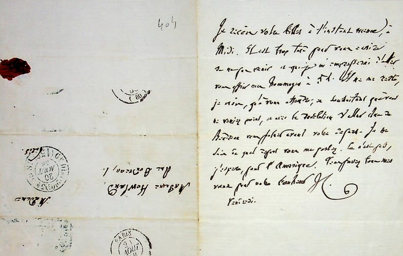 Victor Cousin (1792-1867), philosophe, homme politique, membre de l'Académie française. L.A.S., 20 août 1858, 1p in-12. A Hortense Howland (1835-1920), né Louise-Marie Delaroche-Laperrière. « je reçois votre billet à l'instant même, à midi. Il est trop tard pour vous écrire de ne pas venir et que je m'empresserai d'aller vous offrir mes hommages à 5h. Il ne me reste, je crois, qu'à vous attendre, en souhaitant que vous ne veniez point, et [mots illisibles] avant votre départ. Je ne sais de quel départ pour me parlez. Ce n'est pas, j'espère, pour l'Amérique. Vous savez tous mes voeux pour votre bonheur. VC ». Cachet de la collection Jean-Louis Debauve. [408]