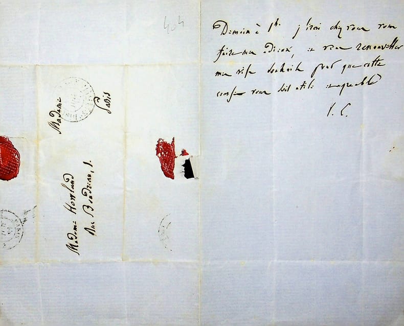 Victor Cousin (1792-1867), philosophe, homme politique, membre de l'Académie française. L.A.S.+enveloppe, 15 octobre 1864, 3p in-12. A Hortense Howland (1835-1920), né Louise-Marie Delaroche-Laperrière. « Ma chère madame Howland, vous n'avez pas affaire à un ingrat. Vous savez qu'à mon retour vous avez eu ma première visite. À la nouvelle de la mort de votre frère, je me suis empressé de vous écrire. Votre silence et la crainte de vous importuner m'ont seuls empêché de vous aller voir. J'apprends avec douleur que vous partez pour l'Amérique. Je en connais malheureusement personne à New-Yorck [sic]; mon seul correspondant était le Dr Henry, professeur de philosophie à l'Université de cette ville, qui l'a quittée il y a quelques années. Puissiez-vous venir à bout de la mauvaise volonté de Mr Howland, et puissiez-vous revenir bien vite et plus heureuse ! Mon voeu est aussi sincère, aussi profond que désintéressé. Je donnerais beaucoup pour pouvoir vous être utile et vous prouver que mon coeur n'est point changé. Vous savez ce qui m'a forcé de ne plus aller chez vous, mais il n'est pas en votre pouvoir de me faire oublier à quel point vous m'avez été chère, quel noble [mot illisible] j'avais tiré pour vous, et quel chagrin j'ai ressenti en voyant mon rêve s'évanouir. Vous le voyez : au moment de vous perdre, la main me tremble d'écrire ce nom fatal d'adieu et je vous quitte le coeur troublé. Je n'ose vous dire les voeux que je forme pour vous, et je me borne à vous assurer que jamais vous ne ferez appel en vain à mes inviolables sentiments. Bien à vous du fond du coeur. Victor C ». Cachet de la collection Jean-Louis Debauve. [408]