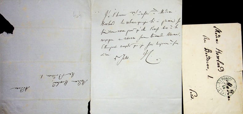 Victor Cousin (1792-1867), philosophe, homme politique, membre de l'Académie française. L.A.S.+enveloppe, 15 octobre 1864, 3p in-12. A Hortense Howland (1835-1920), né Louise-Marie Delaroche-Laperrière. « Ma chère madame Howland, vous n'avez pas affaire à un ingrat. Vous savez qu'à mon retour vous avez eu ma première visite. À la nouvelle de la mort de votre frère, je me suis empressé de vous écrire. Votre silence et la crainte de vous importuner m'ont seuls empêché de vous aller voir. J'apprends avec douleur que vous partez pour l'Amérique. Je en connais malheureusement personne à New-Yorck [sic]; mon seul correspondant était le Dr Henry, professeur de philosophie à l'Université de cette ville, qui l'a quittée il y a quelques années. Puissiez-vous venir à bout de la mauvaise volonté de Mr Howland, et puissiez-vous revenir bien vite et plus heureuse ! Mon voeu est aussi sincère, aussi profond que désintéressé. Je donnerais beaucoup pour pouvoir vous être utile et vous prouver que mon coeur n'est point changé. Vous savez ce qui m'a forcé de ne plus aller chez vous, mais il n'est pas en votre pouvoir de me faire oublier à quel point vous m'avez été chère, quel noble [mot illisible] j'avais tiré pour vous, et quel chagrin j'ai ressenti en voyant mon rêve s'évanouir. Vous le voyez : au moment de vous perdre, la main me tremble d'écrire ce nom fatal d'adieu et je vous quitte le coeur troublé. Je n'ose vous dire les voeux que je forme pour vous, et je me borne à vous assurer que jamais vous ne ferez appel en vain à mes inviolables sentiments. Bien à vous du fond du coeur. Victor C ». Cachet de la collection Jean-Louis Debauve. [408]