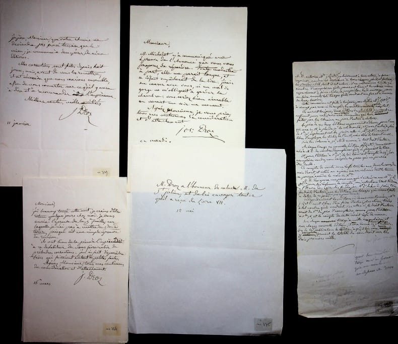 Joseph Droz (1773-1850), philosophe, historien, membre de l'Académie française. 4 L.A.S., années 1840, 4p. Lettres à ses éditeurs, corrections d'épreuves, manuscrits, etc. A la librairie Renouard & Cie (MMrs Tardieu et de Saint Jullien) On joint 2 feuillets manuscrits dont un long manuscrit d'une page in-8 oblong. [409]