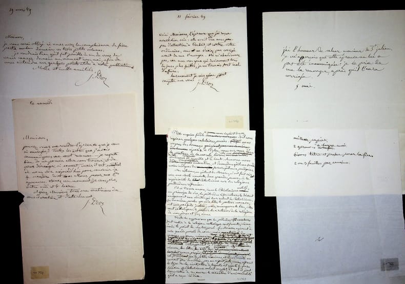 Joseph Droz (1773-1850), philosophe, historien, membre de l'Académie française. 3 L.A.S., années 1840, 4p. Lettres à ses éditeurs, corrections d'épreuves, manuscrits, etc. On joint 3 feuillets manuscrits. [409]
