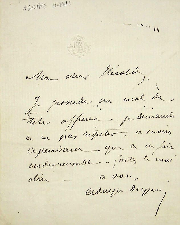 Adolphe Dupuis (1824-1891), acteur. L.A.S., sd, 1p in-12. À Hérold, probablement Jean-Eugène, acteur et régisseur du Théâtre du Gymnase. « Mon cher Hérold, je possède un mal de tête affreux, je demande à ne pas répéter, à moins cependant que ce en fût indispensable. Faites le moi dire. À vous. Adolphe Dupuis ».