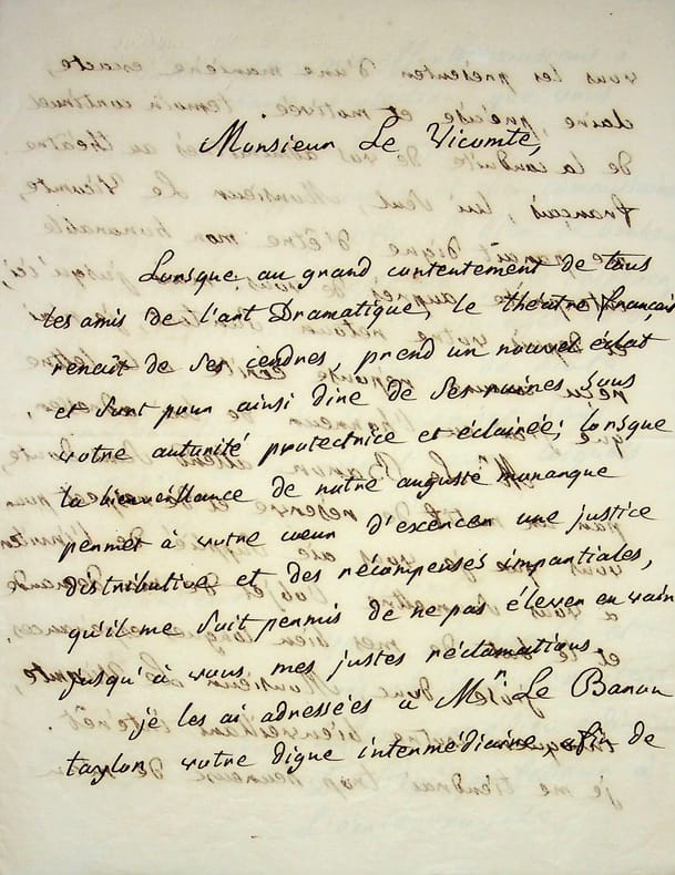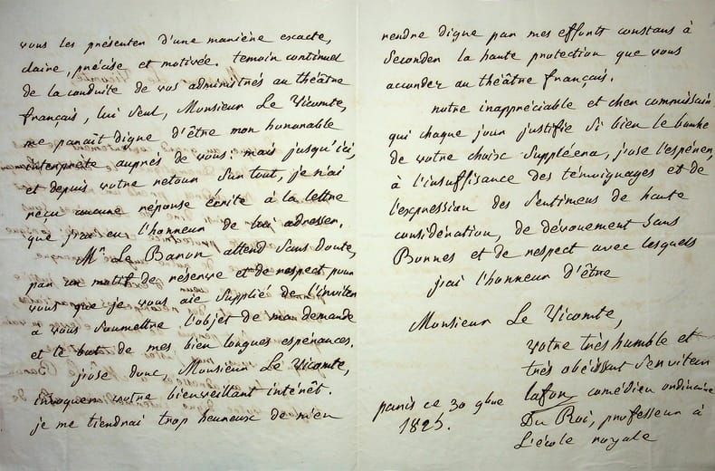 Pierre Rapenouille dit Lafon (1773-1846), fameux tragédien, sociétaire du théâtre français (Comédie-française), pensionnaire du roi. L.A.S., Paris, 30 novembre 1825, 3p in-4. Au vicomte Sosthènes de La Rochefoucauld (1785-1864), directeur des Beaux-Arts. Très belle lettre au moment où le baron Taylor est devenu administrateur de la Comédie-française : « Monsieur le Vicomte, Lorsque au grand contentement de tous les amis de l'art dramatique, le théâtre français renait de ses cendres, prend un nouvel éclat et sort pour ainsi dire de ses ruines sous votre autorité protectrice et éclairée ; lorsque la bienveillance de notre auguste monarque permet à votre coeur d'exercer une justice distributive et des récompenses impartiales, qu'il me soit permis de ne pas élever en vain jusqu'à vous mes justes réclamations. Je les ai adressées à Mr Le Baron Taylor votre digne intermédiaire, afin de vous les présenter d'une manière exacte, claire, précise et motivée. Témoin continuel de la conduite de vos administrés au théâtre français, lui seul, Monsieur Le Vicomte, me parait digne d'être mon honorable interprète auprès de vous : mais jusqu'ici, et depuis votre retour surtout, je n'ai reçu aucune réponse écrite à la lettre que j'ai eu l'honneur de lui adresser. Mr Le Baron attend sans doute par un motif de réserve et de respect pour vous que je vous aie supplié de l'inviter à vous soumettre l'objet de ma demande et le but de mes bien longues espérances. J'ose donc, Monsieur Le Vicomte, invoquer votre bienveillant intérêt. Je me tiendrai trop heureux de m'en rendre digne par mes efforts constants à seconder la haute protection que vous accordez au théâtre français. Notre inappréciable et cher commissaire qui chaque jour justifie si bien le bonheur de votre choix suppléance, j'ose l'espérer, à l'insuffisance des témoignages et de l'expression des sentiments de haute considération, de dévouement sans bornes et de respect avec lesquels j'ai l'honneur d'être, Monsieur Le Vicomte, votre très humble et très obéissant serviteur Lafon, comédien ordinaire du Roi, professeur à l'école royale ». Très beau courrier. [409]