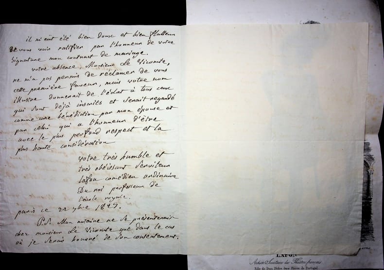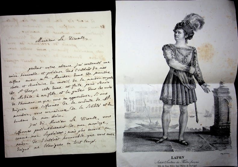 Pierre Rapenouille dit Lafon (1773-1846), fameux tragédien, sociétaire du théâtre français, pensionnaire du roi. L.A.S., Paris, 22 septembre 1825, 2p in-4. Au vicomte Sosthènes de La Rochefoucauld (1785-1864), directeur des Beaux-Arts. « Monsieur le Vicomte, Pendant votre absence, j'ai contracté une union honorable et précieuse dans l'intérêt de mes enfants avec mademoiselle Marcher, dame de première classe et secrétaire du conseil de la maison royale de Saint Denis. Cette dame est faire pour servir de modèle à ma fille et la guider dans les voies de l'honneur, ce que vous en apprendrez, si vous daignez vous informer de la conduite de madame Marcher, vous convaincre de la solidité et du bonheur de mon choix. J'ai dû, Monsieur Le Vicomte, vous informer particulièrement de mon mariage, comme mon supérieur ; mais plus encore en raison de l'intérêt honorable que vous avez daigné me témoigner en tout temps. Il m'eut été bien doux et bien flatteur de vous voir ratifier l'honneur de votre signature mon contrat de mariage. Votre absence, Monsieur Le Vicomte, ne m'a pas permis de réclamer de vous cette première faveur, mais votre nom illustre donnerait de l'éclat à tous ceux qui sont déjà inscrits et serait regardé comme une bénédiction par mon épouse et par celui qui a l'honneur d'être avec le plus profond respect et la plus haute considération, Votre très humble et très obéissant serviteur Lafon, comédien ordinaire du roi, professeur de l'école royale. P.S. : mon notaire ne se présenterait chez Monsieur Le Vicomte que dans le cas où je serais honoré de son consentement ». On joint un portrait de Lafon dans le rôle de Dom Pèdre, dans Pierre de Portugal. Lithographie de F. Noël d'après Colin, pliée, rousseurs. [409]