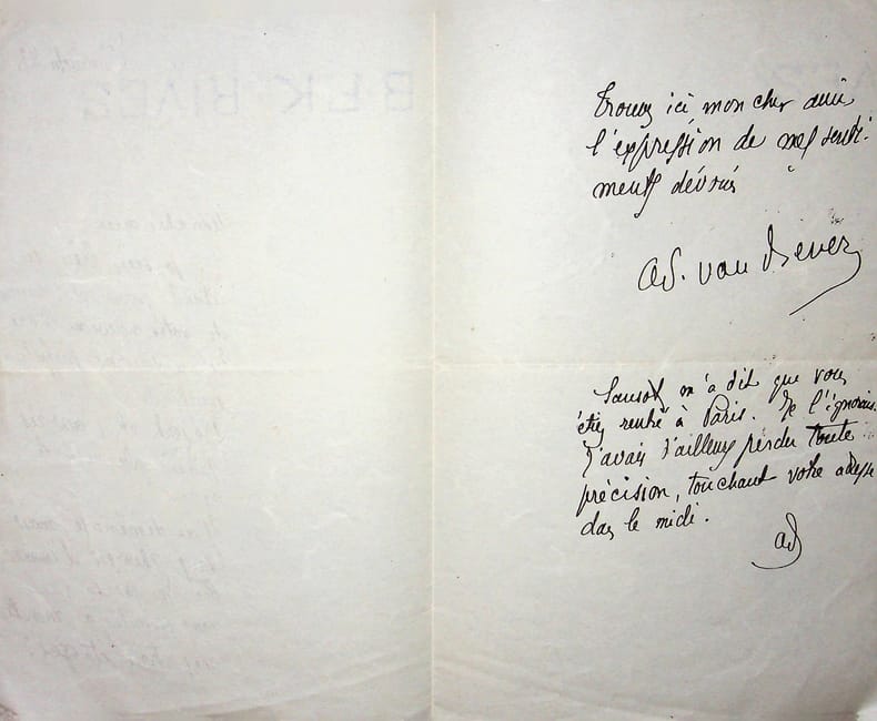 Adolphe van Bever (1871-1927), poète, écrivain, bibliographie. L.A.S., Paris, 21 novembre [ca.1920] Au poète et écrivain Fernand Fleuret (1883-1945). Lettre amicale, mentionnant un incident clos. Les « hommages à madame Reval », que Fleuret épouse après la guerre, permettent de situer la lettre. [409]
