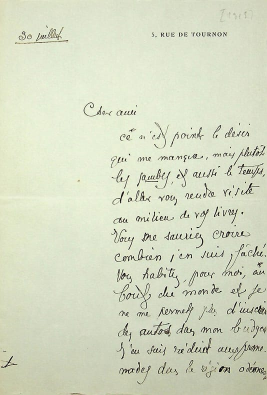 Adolphe van Bever (1871-1927), poète, écrivain, bibliographie. L.A.S., Paris, mardi 2 juillet 1907, 1p 1/2 in-8. Entête du Mercure de France. Au poète et écrivain Fernand Fleuret (1883-1945). Il déplore son absence au moment de la visite de Fleuret et lui indique ses heures de présence au Mercure. [409]