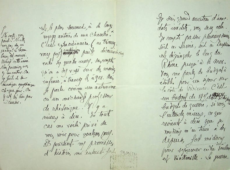 Adolphe van Bever (1871-1927), poète, écrivain, bibliographie. L.A.S., 30 juillet [1915], 4p in-8. Au poète et écrivain Fernand Fleuret (1883-1945). Belle lettre amicale, parlant de ses soucis financiers en temps de guerre, de son voyage prévu en Provence, etc. On notera ce beau passage sur la littérature et Maurice Barrès : « Pas gaie la littérature de ce temps-ci ! C'est curieux comme on a été dupe. On ne parlait que de Barrès. Il s'est fait journaliste. C'est le plus détestable métèque que l'on ait jamais connu. Ah ! Il peut parler de la tradition celui-là. Il en a vraiment le droit ! Que vous en semble ? ». [410]