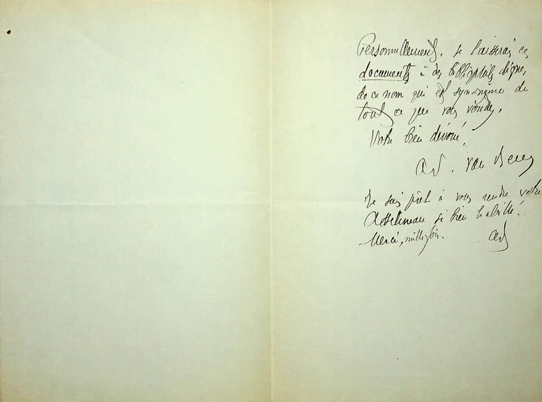 Adolphe van Bever (1871-1927), poète, écrivain, bibliographie. L.A.S., sd [jeudi], 1p 1/2 in-8. Au poète et écrivain Fernand Fleuret (1883-1945). Lettre amicale, mentionnant une trouvaille de Fleuret payée trente huit francs. [410]