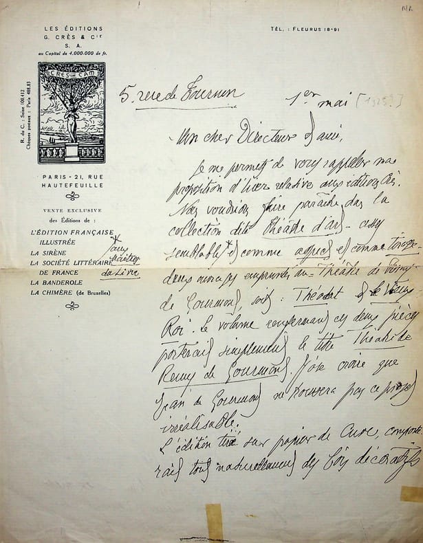 Adolphe van Bever (1871-1927), poète, écrivain, bibliographie. L.A.S., 1er mai 1925, 2p in-4. A l'éditeur et écrivain Alfred Vallette (1858-1935). Belle lettre sur un projet d'édition du théâtre de Rémy de Gourmont. Il lui demande aussi l'adresse de Paul Claudel. [410]
