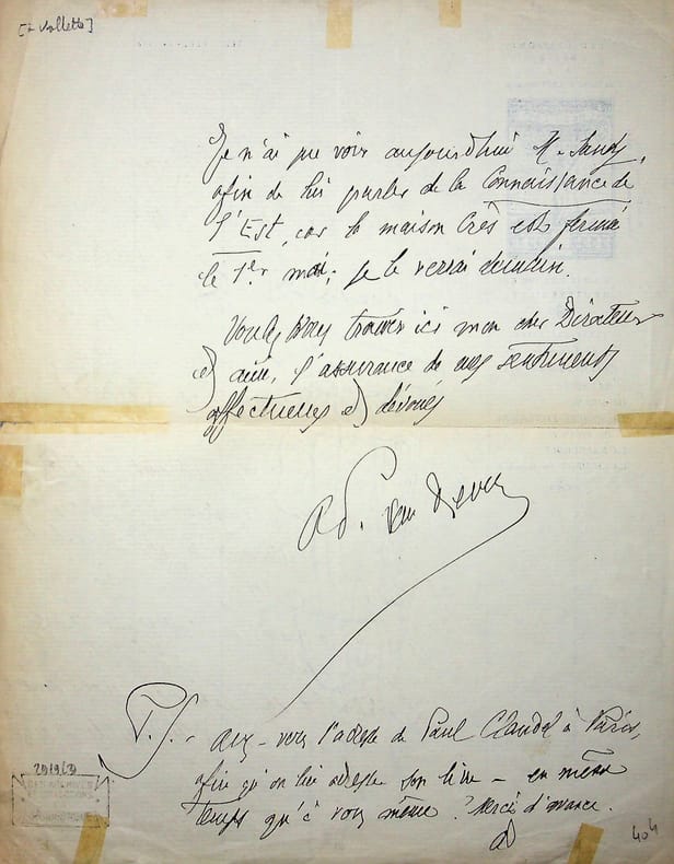 Adolphe van Bever (1871-1927), poète, écrivain, bibliographie. L.A.S., 18 mai [1925], 2p in-8. A l'éditeur et écrivain Alfred Vallette (1858-1935). A propos d'une affaire Claudel qui va être réglée promptement. On joint une lettre de sa femme à Vallette, sur le même papier, alors que van Bever est malade. [410]
