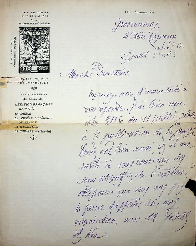 Adolphe van Bever (1871-1927), poète, écrivain, bibliographie. L.A.S., 25 juillet 1922, 2p in-4. A l'éditeur et écrivain Alfred Vallette (1858-1935). Il remercie Vallette qui a aidé à la publication de la « Jungle » (?) en participant aux négociations avec Kra. [410]