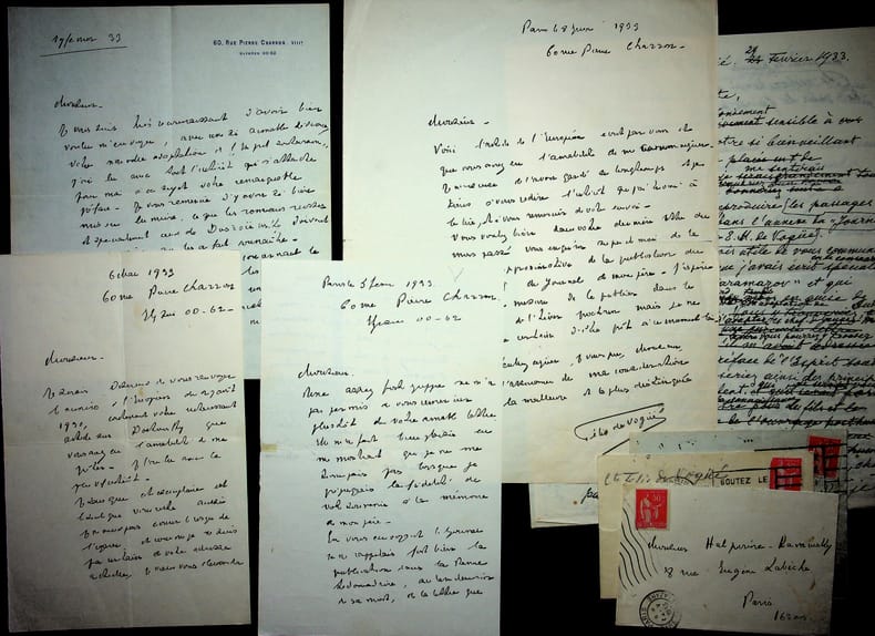 Félix de Vogüé (1882-1946), comte née en Russie. 4 L.A.S.+3 enveloppes, 1933, 7p in-8/in-4. A l'écrivain Ely Halpérine-Kaminsky (1858-1936). Correspondance autour des travaux d'Halpérine Kaminsky, mentionnant un article sur Dostoïevsky, Le Roman russe d'Eugène Melchior de Vogüé (le père de Félix), etc. On joint 2 brouillons de lettres d'Halpérine Kaminsky. [410]