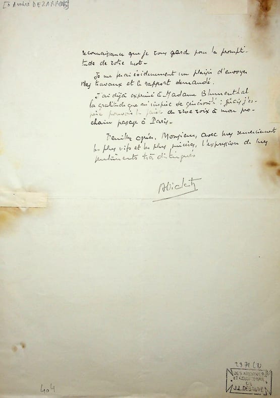 Alexandre Vialatte (1901-1971), écrivain. L.A.S., 4 juillet 1930, 1p 1/2 in-4. A l'historien de l'art et aviateur André Dezarrois (1889-1979). « Monsieur, voudrez-vous m'excuser de répondre si tard à une lettre si aimable, si flatteuse et qui m'a causé tant de plaisir ? Je ne suis revenu que depuis trois ou quatre jours à Clermont et c'est à ce moment seulement que je l'aie lue. Le souci de ma femme malade, de gros travaux de traduction promis à date fixe et un état de surmenage qui m'empêche de faire une lettre sans en déchirer quatre ou cinq brouillons m'ont empêché de vous répondre. J'en suis confus et je vous serais infiniment reconnaissant de bien vouloir m'en excuser. La bourse Blumenthal va me permettre de sortir de bien des contraintes et c'est vous dire la reconnaissance que je vous garde pour la promptitude de votre mot. Je me ferai évidemment un plaisir d'envoyer mes travaux et le rapport demandé. J'ai déjà exprimé à Madame Blumenthal la gratitude que m'inspire sa générosité : mais j'espère pouvoir le faire de vive voix à mon prochain passage à Paris. Veuillez agréer, Monsieur, avec mes remerciements les plus vifs et les plus sincères, l'expression de mes sentiments très distingués. AVialatte ». Vialatte avait en effet eu un prix de 4000 francs. Florence Blumenthal (1873-1930) meurt 2 mois plus tard, le 21 septembre. [410]