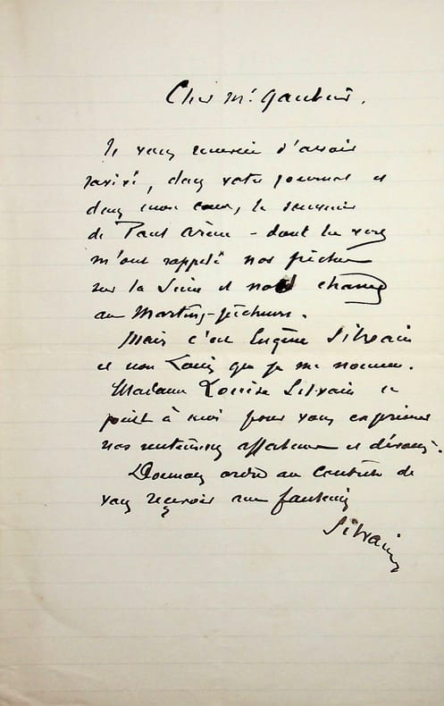 Eugène Sylvain (1851-1930), acteur, sociétaire de la Comédie-française. L.A.S., sd, 1p in-8. A Ernest Gaubert (1880-1945), pour le remercier d'un article sur Paul Arène (1843-1896). Il précise toutefois que Gaubert s'est trompé sur son prénom, le nommant Louis, ajoutant que sa femme se prénomme Louise. [410]