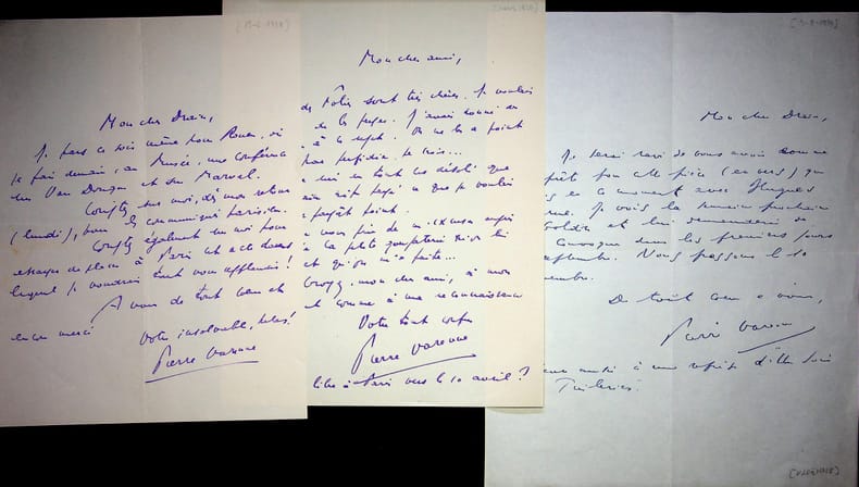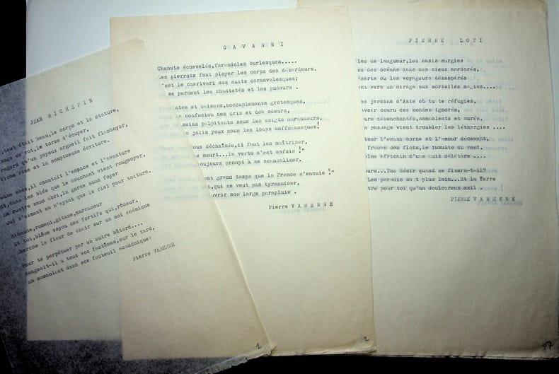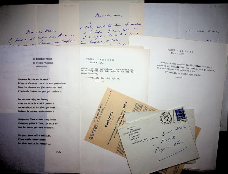 Pierre Varenne (1892-1961), écrivain, journaliste. 3 L.A.S. + 3 enveloppes, 1929-1930, 3p. A l'acteur Emile Drain (1890-1966). Il parle de son travail, une conférence sur Van Dongen, son écriture avec Hugues Delorme, etc. On joint des tapuscrits de poèmes de Varenne dont des sonnets sur les écrivains qui seraient inédits (25 feuillets). [410]