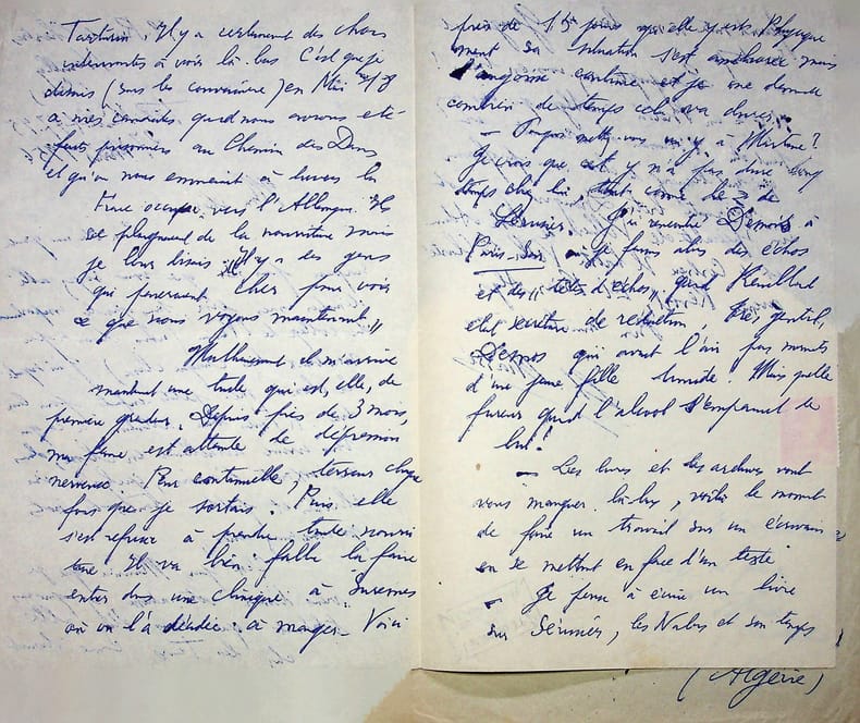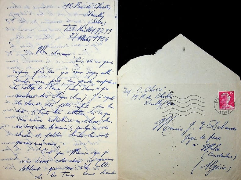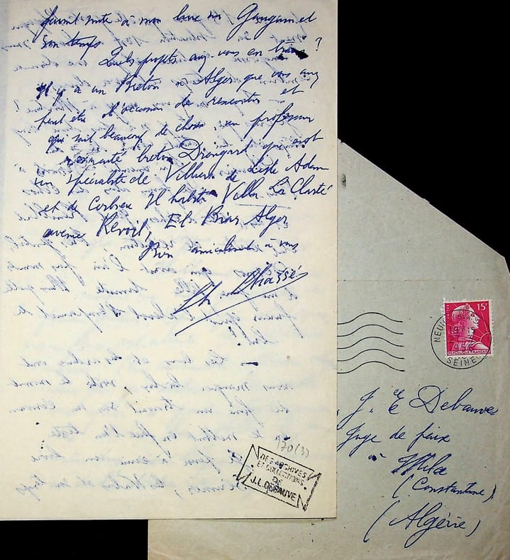 Charles Chassé (1883-1965), écrivain, biographe. L.A.S. + enveloppe, 27 mars 1956, 4p in-8. Au magistrat et collectionneur Jean-Louis Debauve (1926-2016). Longue lettre suite à un article de Debauve sur Chassé, ayant notamment retrouvé ses notes du collège. Nombreux sujets abordés dont ses projets de livres. [410]