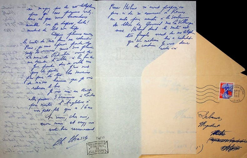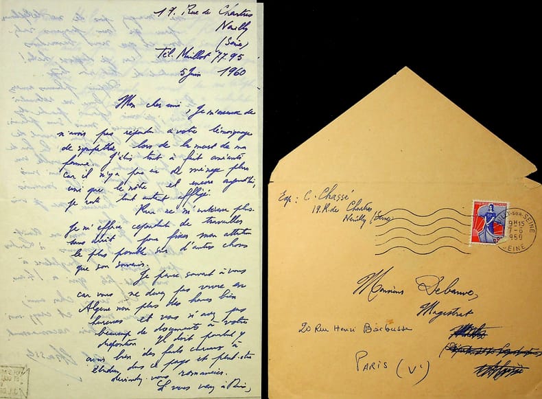 Charles Chassé (1883-1965), écrivain, biographe. L.A.S. + enveloppe, 5 juin 1960, 2p 1/2 in-8. Au magistrat et collectionneur Jean-Louis Debauve (1926-2016). Lettre amicale remerciant Debauve pour sa lettre après la mort de sa femme. [410]
