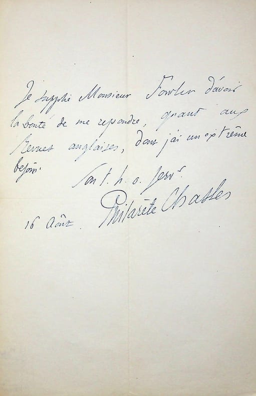 Philarète Chasles (1798-1873), écrivain. L.A.S., 16 août, 1/2p in-8. Il souhaite une réponse de son correspondant, M. Foucher ?, à propos de revues anglaises. [411]