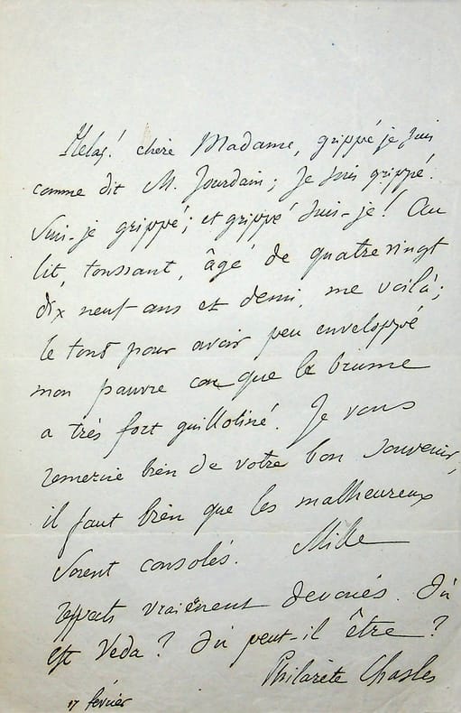 Philarète Chasles (1798-1873), écrivain. L.A.S., 17 février, 1p in-8. Amusant courrier : « Hélas ! Chère Madame, grippé je suis comme dit M. Jourdain ; je suis grippé. Suis-je grippé ; et grippé suis-je ! Au lit, toussant, âgé de quatre vingt dix neuf ans et demi, me voilà ; le tout pour avoir peu enveloppé mon pauvre cou que la brume a très fort guillotiné. Je vous remercie de votre bon souvenir, il faut bien que les malheureux soient consolés. Mille respects vraiment dévoués. Ou est Véda ? Où peut-il être ? Philarète Chasles ». [411]