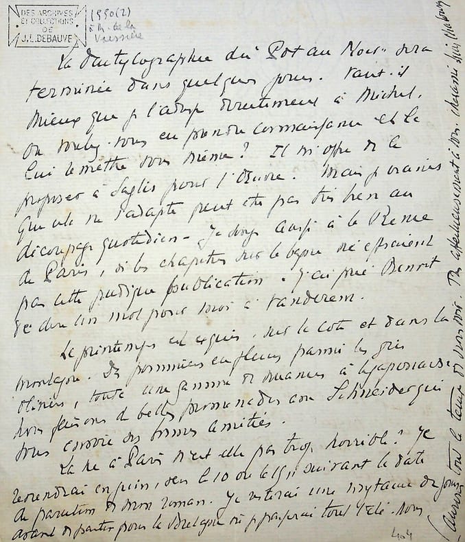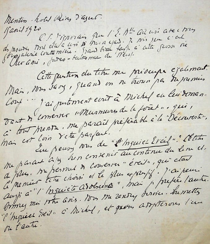 Louis Chadourne (1890-1925), poète, écrivain. L.A.S., Menton, 15 avril 1920, 2p in-8. Au poète Raymond de La Tailhède (1867-1938). Très intéressante lettre autour du titre de son roman, ne l'ayant pas encore choisi. Il a pensé notamment à « Murmures de la forêt », « Découverte », « L'inquiet éveil » et « l'inquiète adolescence ». Il préfère «L'inquiet éveil » et a écrit à Albin Michel. La lettre donne aussi diverses nouvelles. Le titre choisi ne sera pas le préféré de Chadourne mais « L'inquiète adolescence ». Très belle lettre de cet écrivain mort jeune. [411]