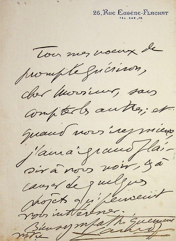 Léon Xanrof (1867-1953), écrivain, chansonnier, compositeur. L.A.S., 5 janvier 1907, 1p in-12. A Henri Mathonnet de Saint Georges (1876?-1948?), écrivain. Veoeux de guérison à son ami. [411]