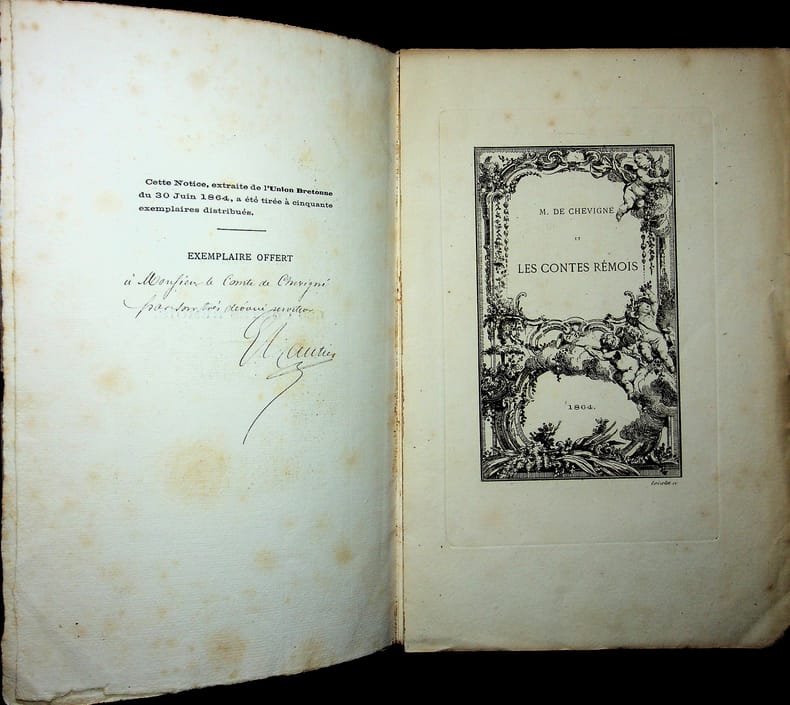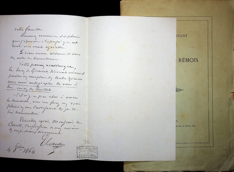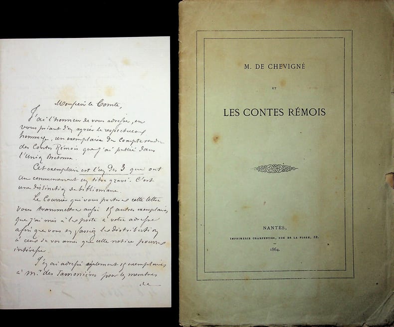 [Louis de Chevigné] Emile Gautier (1833-1872), bibliophile, escroc, receveur des hospices de Nantes dans les caisses desquels il a puissé d'importantes sommes. L.A.S., 4 octobre 1864, 2p in-8. Au comte de Chevigné (1793-1876) en lui envoyant une plaquette contenant son article sur les contes rémois publié à Nantes en 1864. Il précise que l'exemplaire qu'il lui envoie est l'un des 3 portant un titre gravé. On joint ladite plaquette, tirée à 50 exemplaires, avec envoi au comte et bien complète de titre gravé. Le tirage est sur un papier type hollande. Quelques rousseurs, couverture détachée. [411]