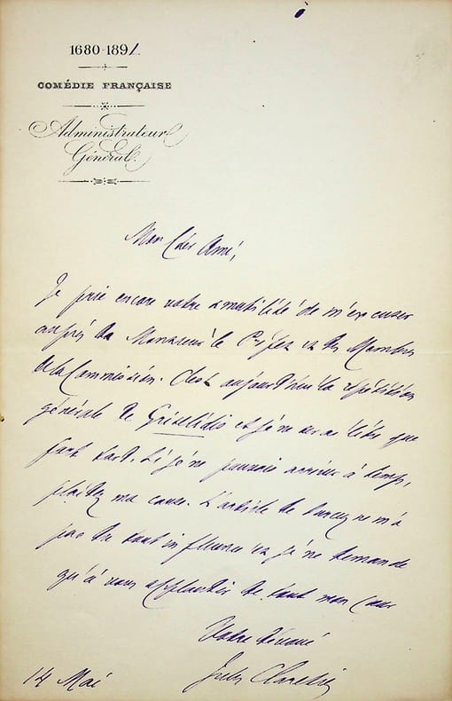 Jules Claretie (1840-1913), écrivain, administrateur général de la Comédie-Française. L.A.S., 14 mai 1891, 1p in-8. Au poète Armand Renaud (1836-1895). Il ne peut venir à une commission car c'est la répétition générale de Grisélidis, d'Armand Silvestre et Eugène Morand (la première aura lieu le lendemain). [411]
