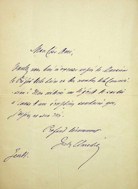 Jules Claretie (1840-1913), écrivain, administrateur général de la Comédie-Française. L.A.S., sd [jeudi], 1p in-8. Au poète Armand Renaud (1836-1895). « A cause d'une éruption soudaine », il ne peut se rendre à une commission. Plis un peu marqués. [411]