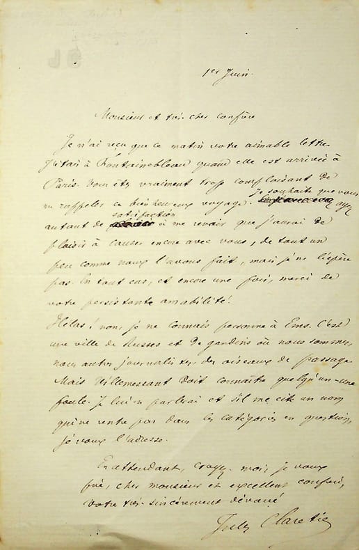 Jules Claretie (1840-1913), écrivain, administrateur général de la Comédie-Française. L.A.S., 1er juin, 1p ni-8. A un confrère. Lettre amicale, mentionnant la ville d'Ems (Bad Ems) en Allemagne, « ville de Russes et de gandins ». Il n'y connait personne mais demande à Villemessant. Cachet de la collection Jean-Louis Debauve. [412]