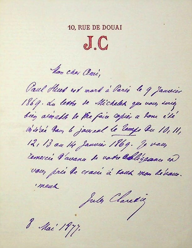 Jules Claretie (1840-1913), écrivain, administrateur général de la Comédie-Française. L.A.S., 8 mai 1877, 1p in-12. A l'écrivain et journaliste Eugène d'Auriac (1815-1891). A propos du peintre Paul Huet (1803-1869) et d'une lettre de Michelet publiée dans le Temps à ce sujet dont il demande la copie. Cachet de la collection Jean-Louis Debauve. [412]