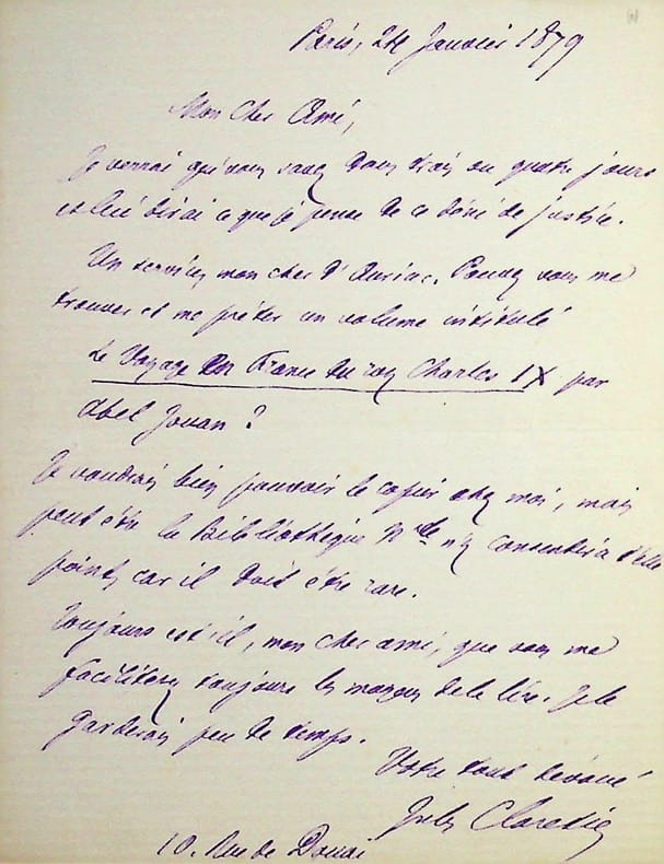 Jules Claretie (1840-1913), écrivain, administrateur général de la Comédie-Française. L.A.S., 24 janvier 1879, 1p in-12. A l'écrivain et journaliste Eugène d'Auriac (1815-1891). Il mentionne un « déni de justice » et lui demande s'il a un livre d'Abel Jouan qu'il souhaite copier. Cachet de la collection Jean-Louis Debauve. [412]