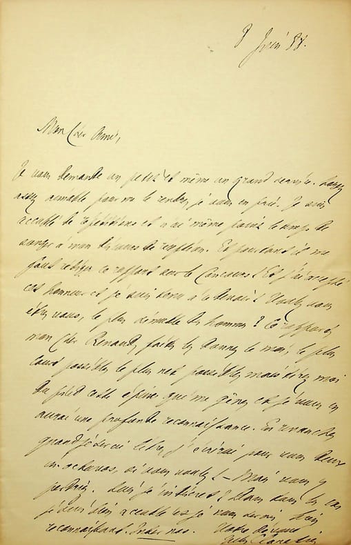 Jules Claretie (1840-1913), écrivain, administrateur général de la Comédie-Française. L.A.S., 8 juin 1888, 1p in-8. Au poète Armand Renaud (1836-1895). Il est accablé de travail et de réceptions et lui demande de l'aide pour la rédaction du rapport d'un concours. On notera d'ailleurs que Jules Claretie est élu à l'Académie française le 26 janvier 1888 et qu'il sera reçu le 21 février 1889. Cachet de la collection Jean-Louis Debauve. [412]