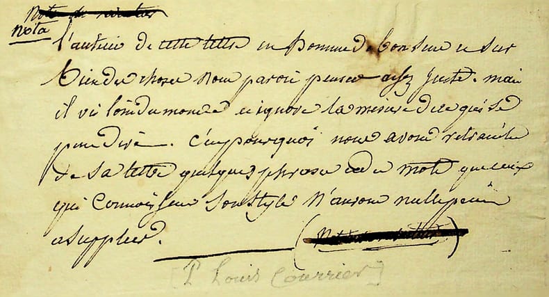 Paul-Louis Courier (1772-1825), écrivain, polémiste. P.A., sd [3 novembre 1823], 1p in-8 oblong. « Nota : l'auteur de cette lettre est homme de bon sens et sur bien des choses nous paroit penser assez juste. Mais il vit loin du monde et ignore la mesure de ce qui se peut dire. C'est pourquoi, nous avons retranché quelques phrases [mot illisible] mots que ceux qui connaissent son style n'auront nulle peine à suppléer ». Cette note fut publiée, avec quelques petites variantes, dans le Journal du Commerce du 3 novembre 1823. Elle termine une lettre ouvrage au rédacteur de La Quotidienne. Les autographes de Paul-Louis Courier sont rares. Cachet de la collection Jean-Louis Debauve. [412]