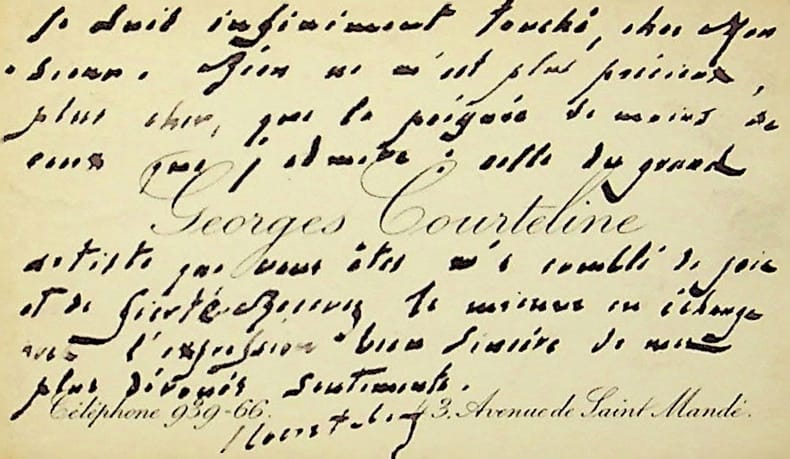 Georges Courteline (1858-1929), écrivain. C.A.S., sd, 8 lignes. Au mime Georges Wague (1874-1965). « je suis infiniment touché, cher Monsieur. Rien ne m'est plus précieux, plus cher, que la poignée de mains de ceux que j'admire : celle du grand artiste que vous êtes m'a comblé de joit et de fierté. Recevez la mienne en échange avec l'expression bien sincère de mes plus dévoués sentiments ». Cachet de la collection Jean-Louis Debauve. [412]