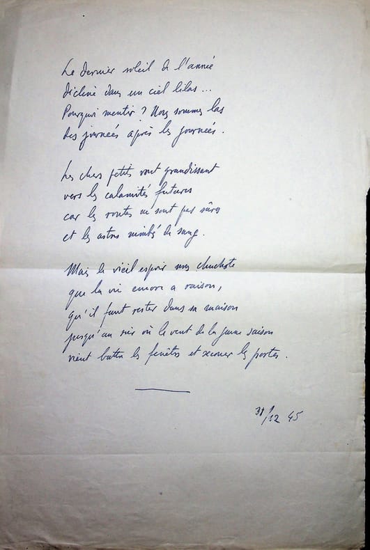 Guy-Charles Cros (1879-1956), poète. Poème autographe, 31 décembre 1945, 1p in-folio. Poème de 13 vers commençant par « Le dernier soleil de l'année / décline dans un ciel lilas. ». Nous ne savons pas s'il a été publié. Cachet de la collection Jean-Louis Debauve. [412]